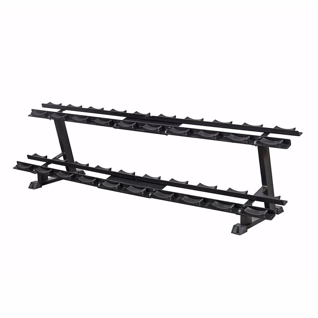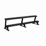 Stojan na jednoručky Gymleco s kapacitou 10 párov a dĺžkou 2,3 m je špičkové úložné riešenie pre profesionálne fitness centrá aj tréningové štúdiá. Je vybavený špeciálne navrhnutými držiakmi na jednoručky (dumbbell cups), ktoré Gymleco vyvinulo pre maximálnu stabilitu a bezpečné uloženie činiek. Dve priestranné police umožňujú prehľadné usporiadanie činiek rôznych hmotností, aby boli vždy ľahko dostupné. Masívna oceľová konštrukcia s čiernou povrchovou úpravou garantuje dlhú životnosť a vysokú odolnosť aj pri každodennom intenzívnom používaní. Stabilný dizajn stojana eliminuje riziko poškodenia vybavenia či podlahy. Funkčné prevedenie a čistý vzhľad zapadnú do každého moderného fitness priestoru. Tento model je ideálnou voľbou pre zariadenia, ktoré vyžadujú spoľahlivé, profesionálne a bezpečné úložné riešenie.
