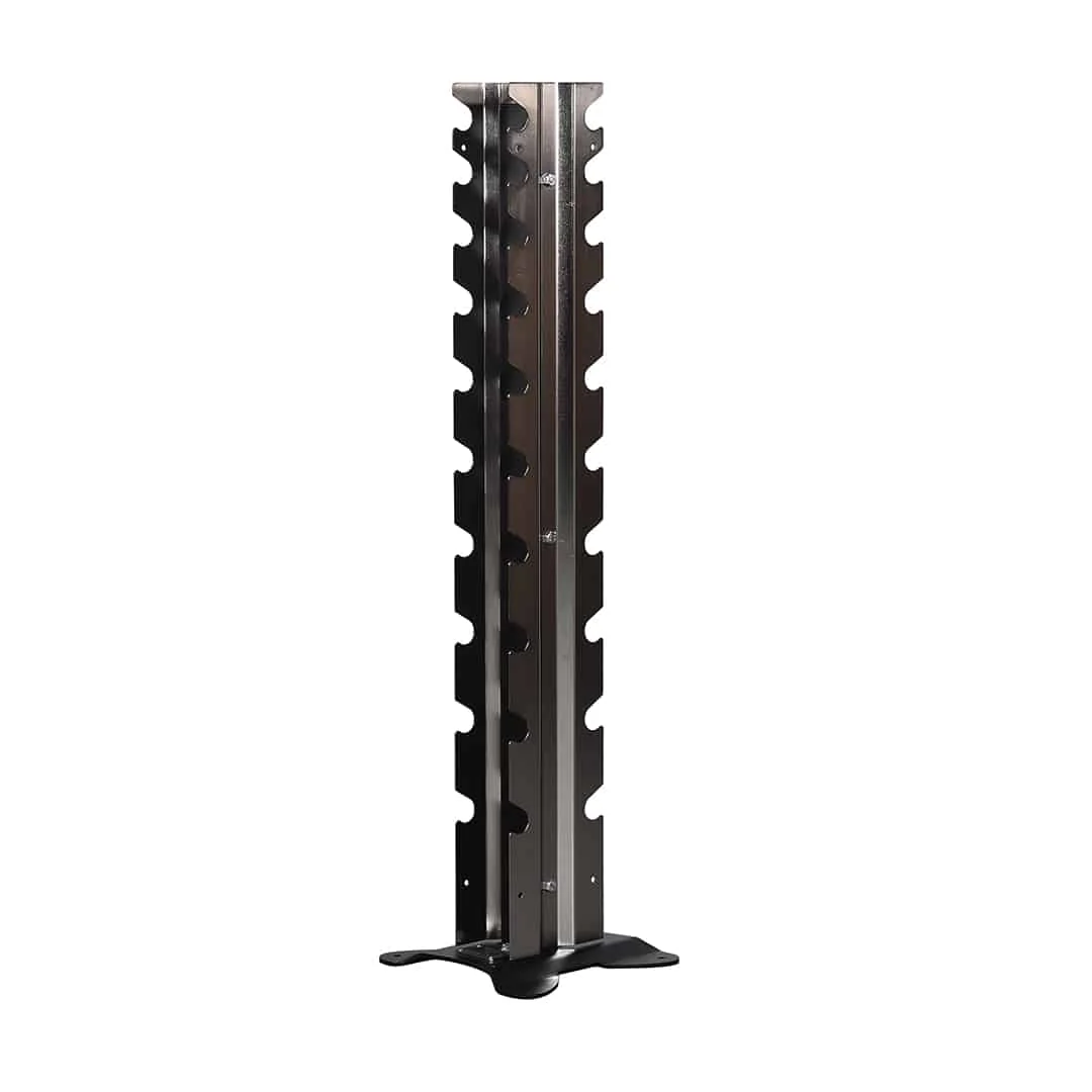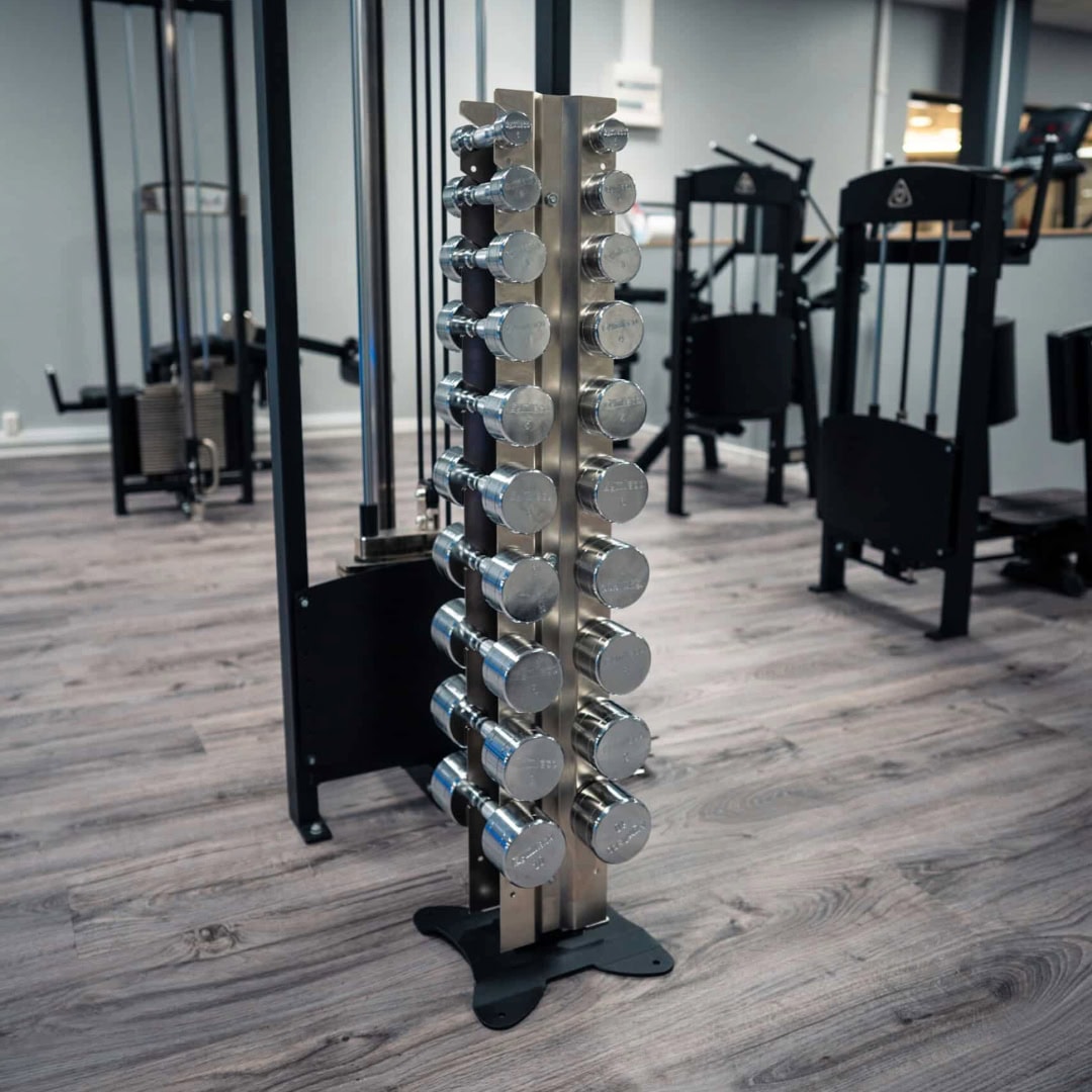 Vertikálny stojan na jednoručky Gymleco s kapacitou 10 párov je navrhnutý špeciálne pre činky s hmotnosťou od 1 do 10 kg. Chrómová konštrukcia v kombinácii s čiernou základňou zaručuje nielen vysokú odolnosť a stabilitu, ale aj elegantný vzhľad vhodný do profesionálnych aj súkromných fitness priestorov. Kompaktný dizajn stojana umožňuje efektívne a prehľadné uskladnenie činiek pri maximálnej úspore podlahového priestoru. Stabilná základňa eliminuje riziko prevrátenia a zvyšuje bezpečnosť pri odkladaní alebo vyberaní činiek. Tento model pomáha udržiavať poriadok v tréningovej zóne a zároveň prispieva k bezpečnejšiemu a komfortnejšiemu prostrediu počas cvičenia. Je ideálnou voľbou pre fitness centrá, športové kluby aj menšie tréningové štúdiá, ktoré dbajú na efektívnu organizáciu vybavenia.